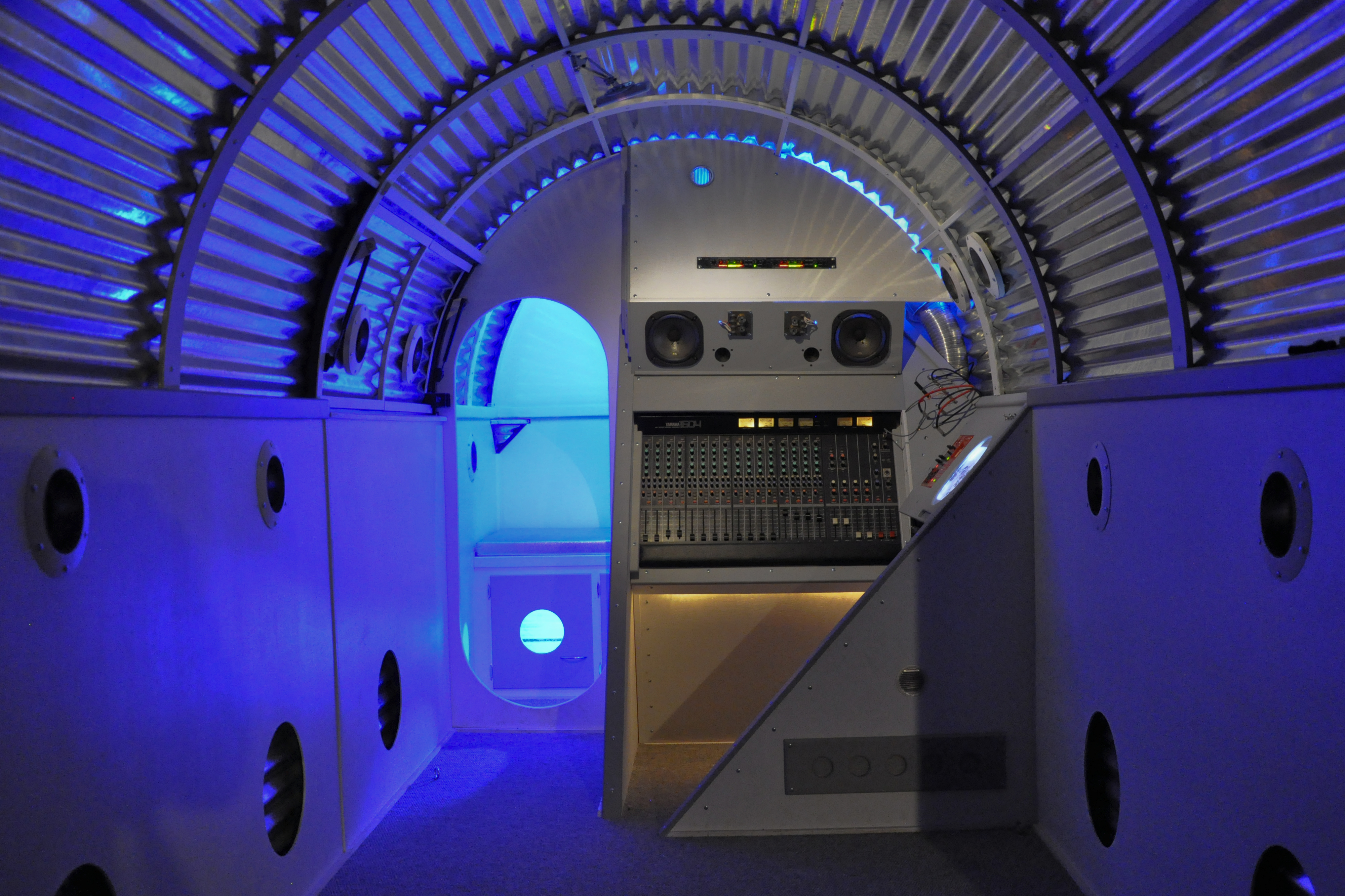 The EAR1 Command Module, 2013 (ECM) is an interactive sculpture designed with three main sections. The forward compartment is the map room, equipment storage, and sleeping quarters. The center section is the control center for sound recording and reinforcement, and the back section of the ECM is the area for transporting the rover and offloading it by ramp in various environments. I once again turned to NASA and science for inspiration in designing my command module. I’ve often contemplated the environments space explorers are confined to during their travels in orbit and to the moon. The vehicles, like the international space station and the lunar command module are not only sophisticated exploratory instruments they are environments to sustain life away from Earth. In essence they are environments constructed to explore environments. This basic idea is how I began constructing the EAR1 Command Module.